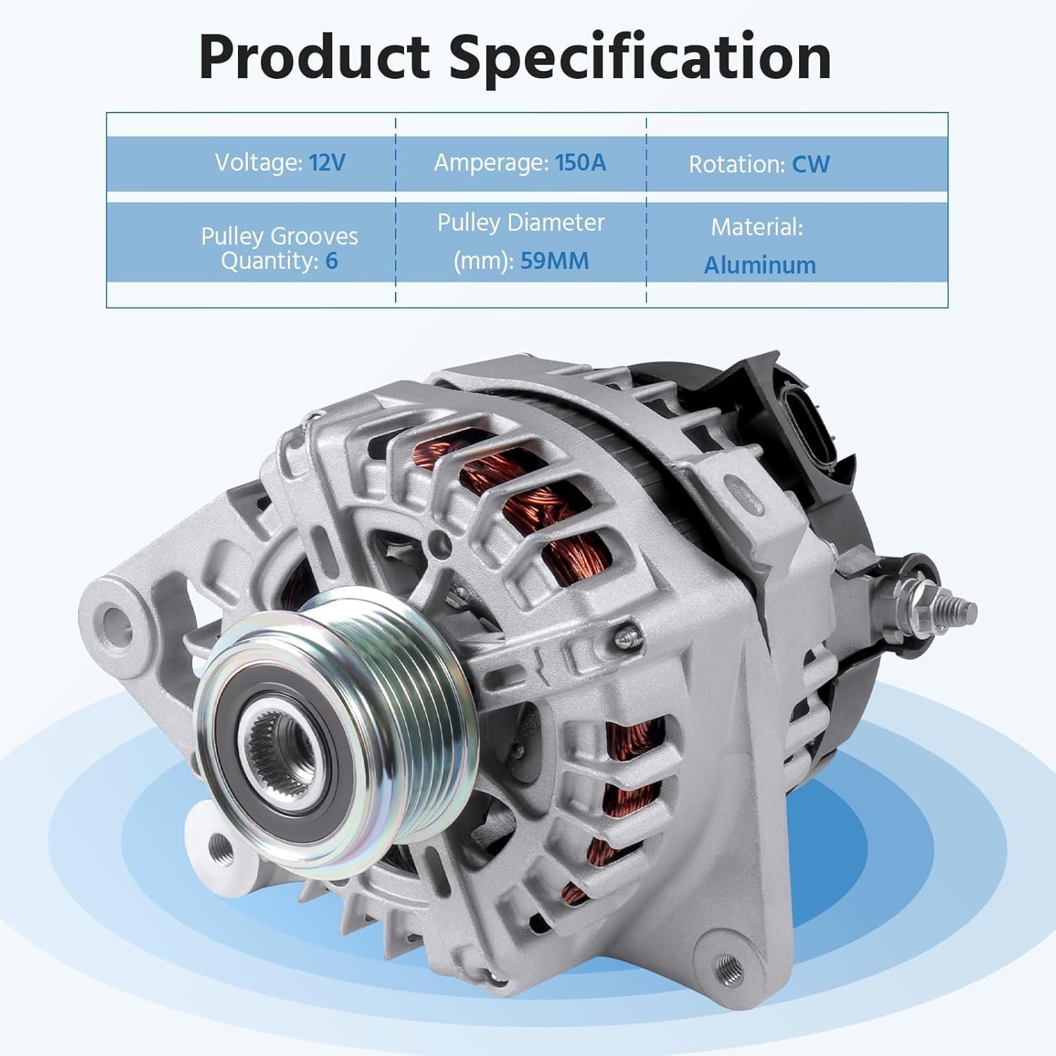 150A Alternator 373002E721 Fit for Hyundai Elantra & Kia Forte, 2.0L, l4 GAS, 2017 2018 2019 2020 2021 2022 2023 2024 - Replace 11934 6-Groove Clutch Pulley Clockwise Alternator 12V Clockwise, 6-Groove Clutch PulleyOE Replace Number: 373002E721,37300-2E721, 11934, 11934N, 11313, 61001473 High Output Alternator ReplacementCompatible with Kia 2017-2024:2017-2019 Kia Forte LX2017-2019 Kia Forte S2017-2021 Kia Forte EX2019-2022 Kia Forte FE2019-2024 Kia Forte LXS2020-2024 Kia Forte GT-Line2023-2024 Kia Forte LXCompatible with Hyundai 2017-2020:2017-2020 Hyundai Elantra Limited2017-2020 Hyundai Elantra SE2017-2020 Hyundai Elantra Value Edition2018-2020 Hyundai Elantra SEL*Fit all 2.0L L4 GAS Models.Specification:Voltage: 12VAmperage: 150ARotation: CWPulley Grooves Quantity: 6Pulley Diameter(mm): 59MMMaterial: Aluminum