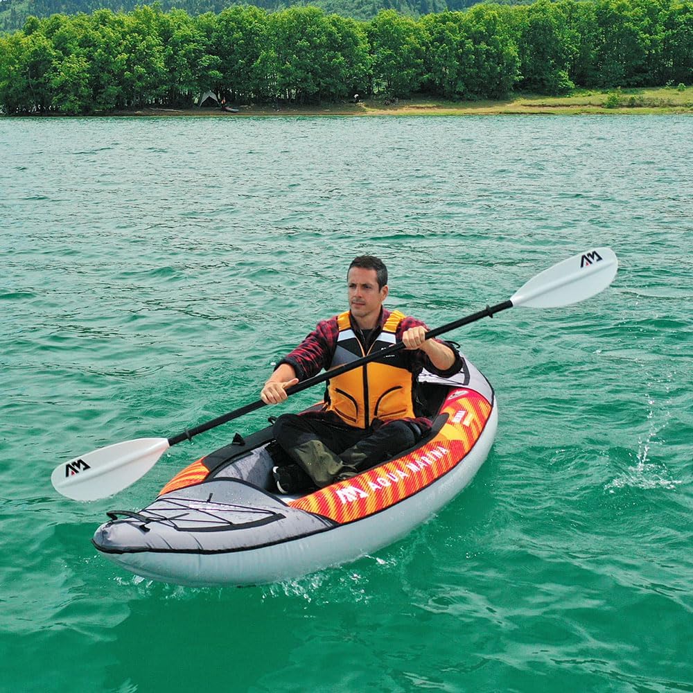 Aqua Marina Laxo 1-Person Inflatable Leisure Kayak 2021 is ideal for both beginners and advanced paddlers for use on rivers and lakes. Features are floor cover and top hull of side chambers constructed of premium polyester hull cover for long-lasting UV protection, V-shape bottom floor for outstanding tracking ability, generous deck space for extra comfort and stability, multiple rubbers carries a handles for easy transport, a durable Boston valve for easy inflation, premium adjustable kayak seat with high backrest, spongy cushion and multiple storage pockets, water splash guard bow with a cargo bungee cord on both bow and stern, multiple heavy-duty strap buckles allow adjusting seat position and high-performance fin system for excellent tracking ability. Measures 285 cm length by 95 cm width.