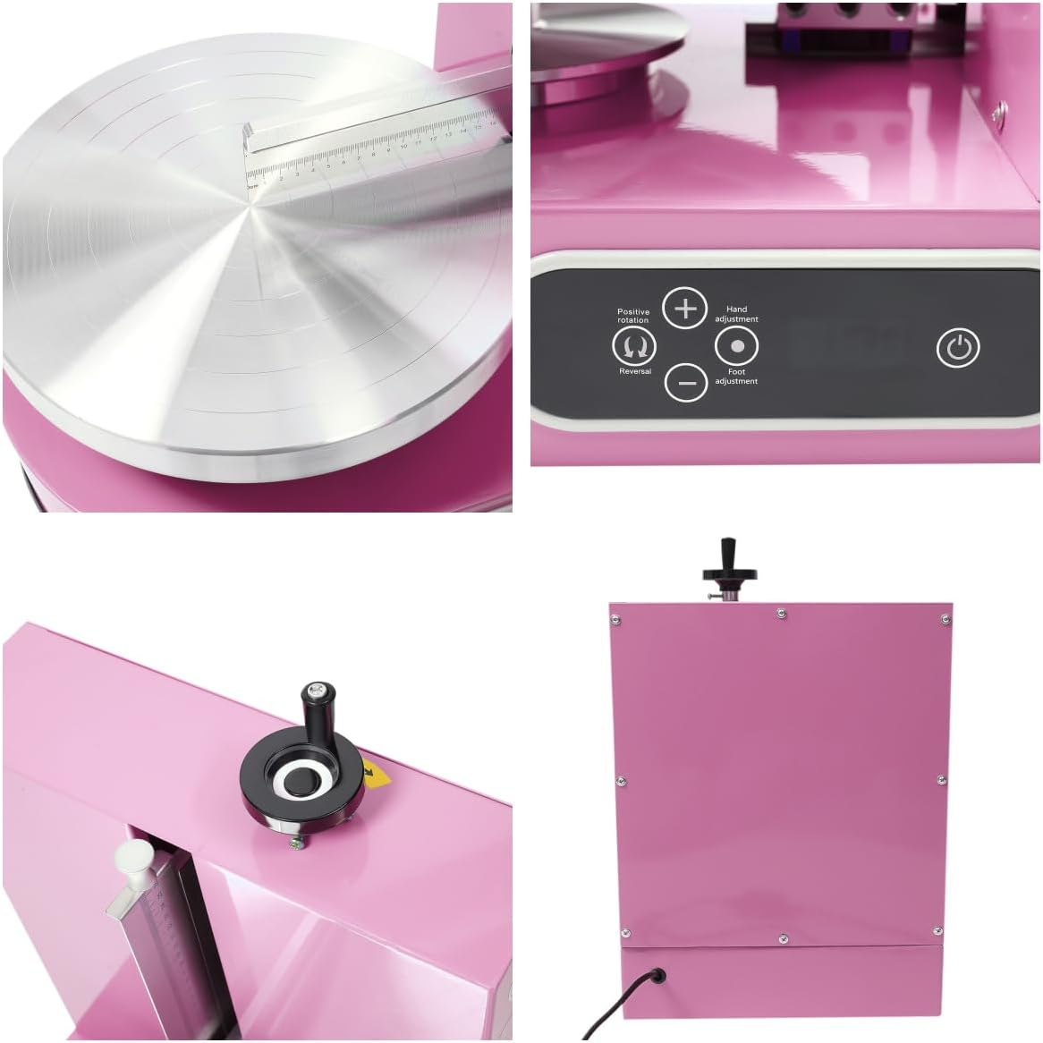 How to Operate:1. First, put the cake blank (not included) in the center of the turntable.2. Adjust the distance between the horizontal knife and the vertical knife.3. Turn on the power and adjust the rotation speed of the turntable (60-80rpm). Use a decorative bag to apply cream on the side from bottom to top; Apply evenly from the center to the outside.4. Clean the cream on the horizontal and the vertical knives.5. Adjust the pressing force of the horizontal knife when water chestnut appears.6. Move the horizontal and vertical knives away and complete troweling the cake blank.SpecificationsMaterial: Iron, Aluminum Alloy, Stainless SteelProcess: Plastic Spraying Color: Green/Pink/WhiteMotor Type: Pure Copper MotorMount Type: TabletopAssembly Required: YesVoltage: 110-220VPower: 200WRotation Speed: 60-320rpmNoise: 60dBDisplay Type: LCDPlug Type: US StandardPower Source: Corded ElectricLeakage ProtectorModel: YM-16 PRCDVoltage: 125V~15Al△n: 10mA t<0.1sMax. Horizontal Knife Lifting Height: 20cm/7.9inVertical Knife Travel Distance: About 17.5cm/6.9in (From the Edge of the Turntable to the Center)Applicable Cake Size: 10-30.5cm/4-12inGross Weight: 23kg/50.7lbsNet Weight: 21kg/46.3lbsTurnable Diamater: 35cm/13.78inOverall Product Size(L*H): 42*50cm/16.54*19.69inTop Platform Size: 36.5*11cm/14.37*4.33inPackage Size: 56*55*43cm/22*21.65*16.93inPackage Included1* Cake Decorating Machine1* English ManualNotes1. Please read the user manual and labels carefully, paying particular attention to safety precautions.2. Please do not touch the turntable with your hands while the machine is running to avoid scratches.3. Please allow the slight color difference caused by the shooting light and 1-3cm error due to manual measurement, and make sure you do not mind before you order.
