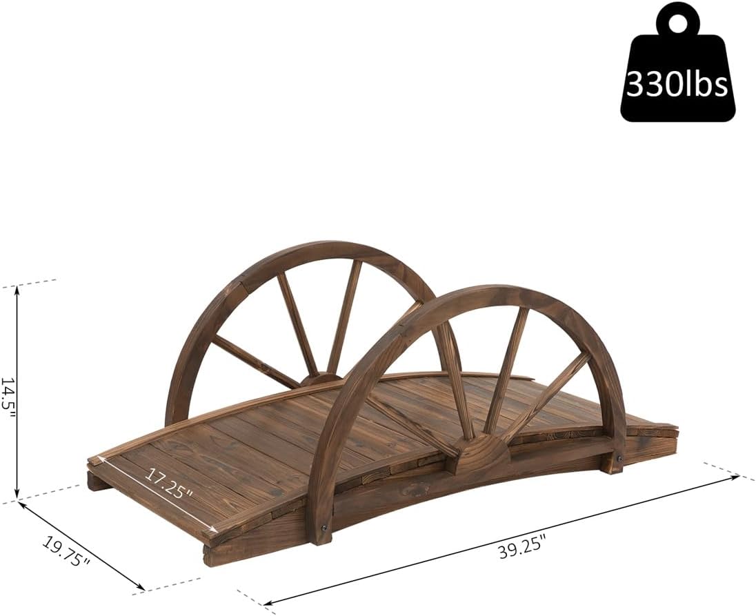 Features:● Enhance Your Garden: Backyard wood bridge over a small stream or garden walkway and add a decorative touch to your outdoor surroundings.● Complementary Beauty: The elegant arched garden bridge frame adds an instant and classic charm with its traditionally designed walkway.● Beautiful & Practical:There are half-wheel style rails on each side of the pond bridge kit which makes you feel more at ease when crossing and looks more beautiful● Solid Construction: The wood of this bridge has a natural finish that is weather-resistant to prevent rot, cracking, and splitting.● Strong Weight Capacity: The durable fir wood construction of this garden bridge for outdoors is designed to hold up to 330 pounds of weight.Specification:Color: Stained WoodMaterial: Fir WoodOverall Dimensions: 39.25" L x 19.75" W x 14.5" H,Bridge Length: 3.3'- Bridge Surface Size: 39.25" L x 17" WNet Weight: 10 lbs.Weight Capacity: 330 lbs.