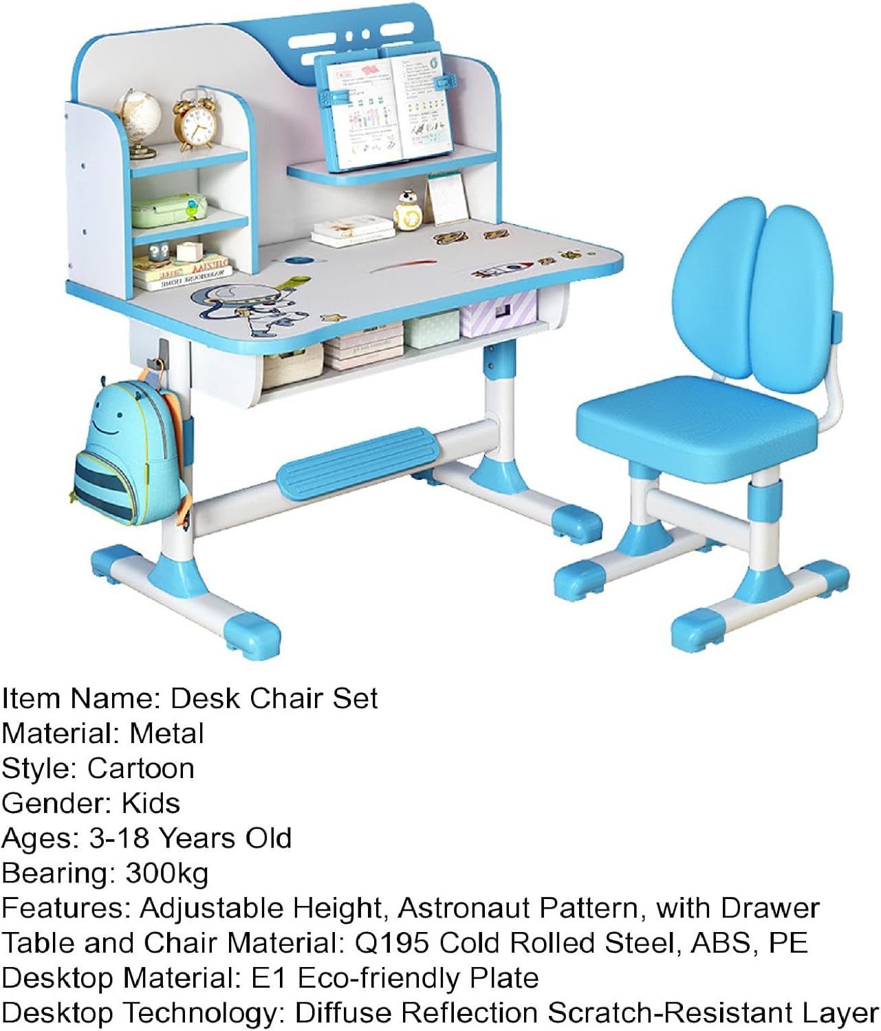 Give your child the perfect space to learn, create, and grow with our Astronaut-Themed Kids Desk and Chair Set. Designed to support healthy habits from preschool through teenage years, this ergonomic study station combines a playful theme with serious functionality to inspire a lifelong love of learning. Our focus is on your child's well-being. The chair's dual-back support and the desk's Golden Distance design work together to encourage proper sitting posture, reducing strain on the spine and eyes. The entire set adjusts in height to maintain this healthy alignment as your child grows. The desktop is made from safe, E1 grade eco-friendly material with a scratch-resistant surface for daily use. We built this set for durability and stability to withstand energetic kids. The reinforced steel frame and thickened carbon steel legs provide a solid, wobble-free foundation with an exceptional 300KG load capacity. The wide 31.5-inch desktop offers plenty of room for homework and projects, while the large drawer and organized top help teach valuable tidiness skills. Easy to assemble and designed to last, this complete study set is the ideal gift to create a dedicated and inspiring learning environment for your child's educational journey. Product Specifications: Desk Size: 43.73" L x 31.52" W x 21.28" H Chair Size: 33.1" L x 16.55" W x 14.58" H Materials: Steel Frame, E1 Eco-Friendly Plate, ABS, PE Load Capacity: Up to 300KG Age Range: 3-18 Years Package Includes: 1 x Desk, 1 x Chair, 1 x User Manual.