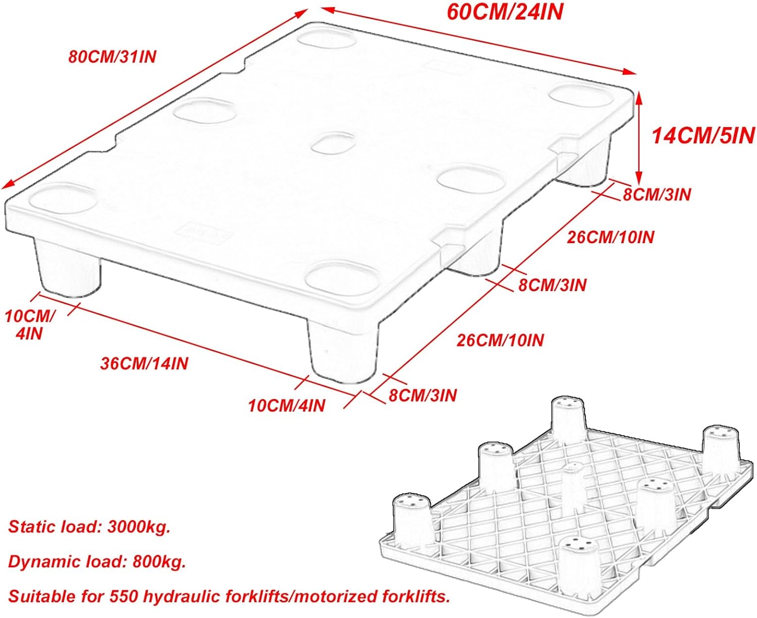 Product Details:Material: PolyethyleneThis product is made of high-density polyethylene, possessing excellent toughness, ensuring durability and resistance to cracking.Its superior resistance to high and low temperatures (-40℃ to 120℃) makes it suitable for both normal environments and cold storage.Product Details:1. The pallet surface features a frosted design to effectively prevent goods from slipping, and the 5-inch elevation effectively prevents goods from getting damp.2. The four corners of the pallet are rounded to avoid bumps during handling, making it safer to use and reducing wear and tear, thus extending its service life.3. This product includes two pallets of the same size, which can be freely combined to easily form the required size, facilitating large-scale deployment and perfectly suited for large and irregular areas. The pallets can also be stacked for flexible use when cleaning the ground.4. The pallet bottom features a reinforced design with uniform wall thickness and evenly distributed support feet, ensuring even stress distribution and high compressive strength. A single pallet can withstand a static load of up to 3000kg, ensuring durability.5. The pallet is integrally molded without seams, and the bottom of the support legs is hollowed out for easy washing and drainage.Multi-scenario use: This is a multi-functional pallet, suitable not only for warehouse goods pallets and cold storage mats, but also for raising and protecting household items from moisture, among other applications.Colors: Blue, Red, Green, Yellow.Different colors meet different usage environments and can also be used to delineate functional areas.Dimensions: 60x80x14CM/24x31x5IN, Static load: 3000kg, Dynamic load: 800kg;75x105x14CM/29x41x5IN, Static load: 3000kg, Dynamic load: 800kg.Can be handled by a 550 manual hydraulic forklift/motorized forklift.