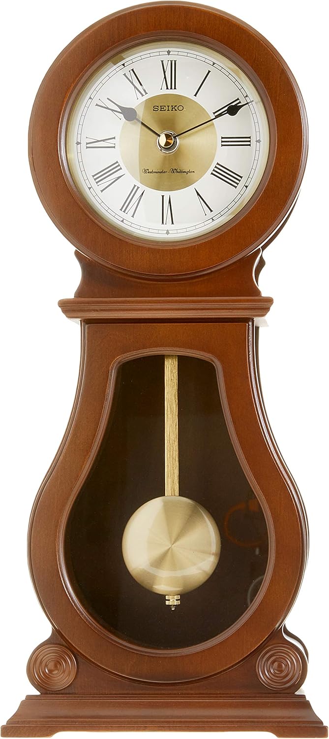 This classic pendulum clock on your mantle or a side table makes a statement with a beautiful wood finish, swinging metal pendulum, and an analog clock above it. That clock features Roman numeral hour markers and a gold-tone center to match the pendulum. Each quarter-hour you’ll hear the Westminster/Whittington chimes, whose volume is easily controlled to your preference and can be silenced during the night. The pendulum volume is also easily adjusted. Powered by 1 C battery (included). Overall dimensions 15. 35 X 6. 69 X 4. 33 inches.